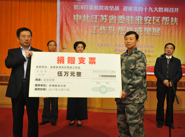 仪式上,刘正友代表井神股份将5万元现金支票转交给省委驻淮安区帮扶工作队队长、淮安区委副书记叶忠华。刘正友表示,井神股份公司坐落于周总理故乡-淮安,作为国有上市企业,有义务参与地方脱贫攻坚行动,履行企业社会责任, 我们将认真贯彻落实扶贫攻坚计划要求,帮助淮安区贫困人口脱贫致富,共同建设好周总理家乡。叶忠华代表省委驻淮安区帮扶工作队和淮安区向井神股份公司表示感谢,并介绍了近年来帮扶工作开展情况。仪式结束后,刘正友和其他领导共同参观了省委驻淮安区帮扶工作队帮扶成果展。