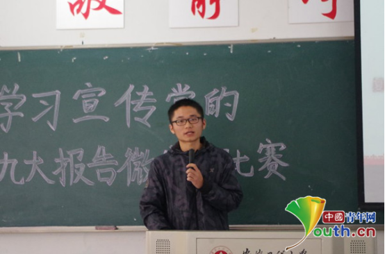 徐云峰参加学校十九大精神微宣讲比赛。本人供图 而让安徽工程大学的徐云峰感受最深的是浓厚的人民情结。他说,“过去的五年间,从十八洞村‘我是人民的勤务员’到马庄村‘买个香包捧捧场’,从太行深处到西南边陲,从黄土高原到大别山,处处留下了总书记的足迹。他始终和人民群众站在一起,心里始终想着人民群众。” 2018年是全面学习宣传贯彻党的十九大精神的开局之年。党的十九大描绘了我国发展今后30多年的美好蓝图。九层之台,起于累土。要把这个蓝图变为现实,必须不驰于空想、不骛于虚声,一步一个脚印,踏踏实实干好工作。 新的一年里,无论在哪个岗位,梦想都需要创造,幸福都需要奋斗!新时代的天地如此广阔,只需大步前行!(责任编辑:刘喆)